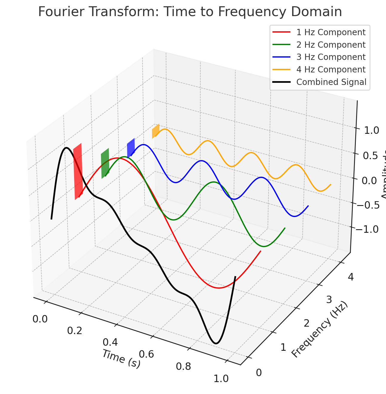 A Fourier transformation shows the relationship between the frequency and time domains. Within the frequency domain, we can see individual sinusoidal waves, while in the time domain, we observe a composed waveform made up of each frequency or each part.