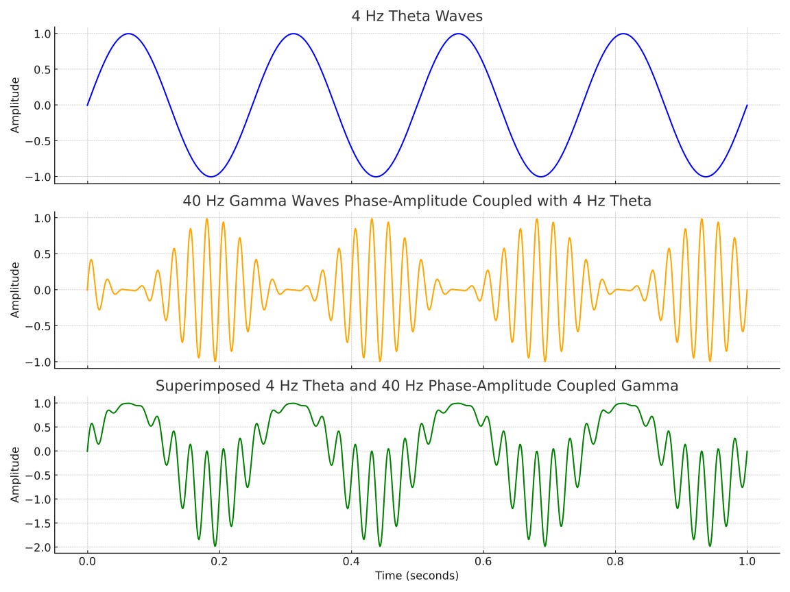 The image above shows a 4 Hz theta wave, with a 40 Hz gamma wave cross-frequency coupled upon the slow theta wave.