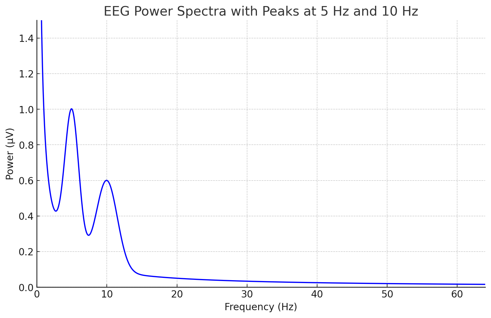 An EEG power spectra showing 5 Hz theta and 10 Hz alpha peaks. The 10 Hz alpha may be normal, but the 5 Hz theta might reflect dysregulatiom and conditioned thinking.
